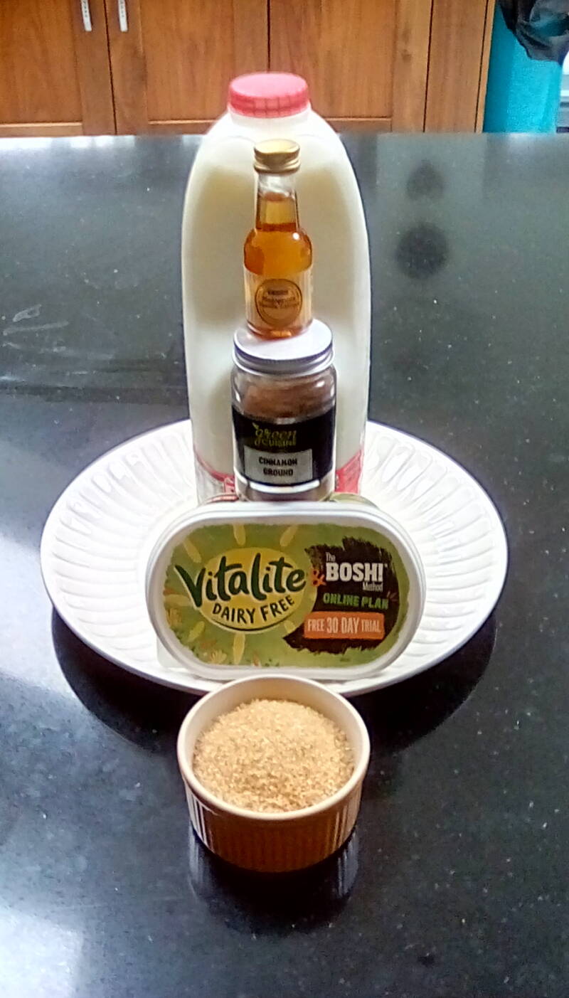 Opening up the cupboard what did I see? Cinnamon, so I thought I'd give it a go. Out came the vegan butter, and brown sugar, stirred like crazy then once sticky any gooey didn't know what to do. So added a little milk, then a heaped tablespoon of the cinnamon and some vanilla.